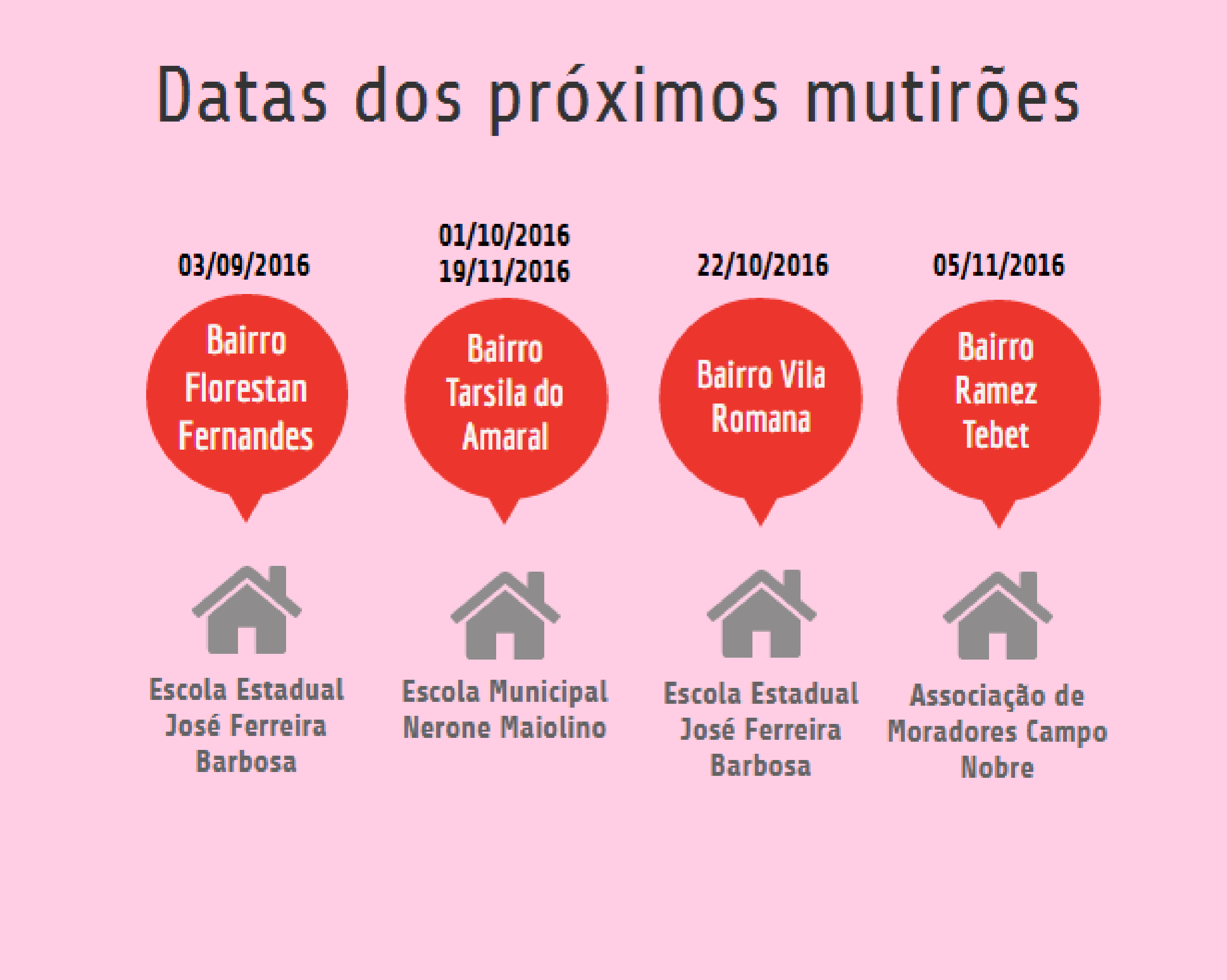 O próximo mutirão acontece no dia 3 de setembro, na Escola Estadual José Ferreira Barbosa, no bairro Florestan Fernandes. O horário de atendimento é das 9h00 às 13h00. Além da capital, há mutirões realizados em cidades no interior do estado. Neste mês, as cidades atendidas são Ribas do Rio Pardo, Sidrolândia e Coronel Sapucaia. Os mutirões ocorrem até maio de 2017. De acordo com Sophia Safalon, após esse período, o projeto poderá ser prorrogado, o que dependerá do número de casas regularizadas até a data.
