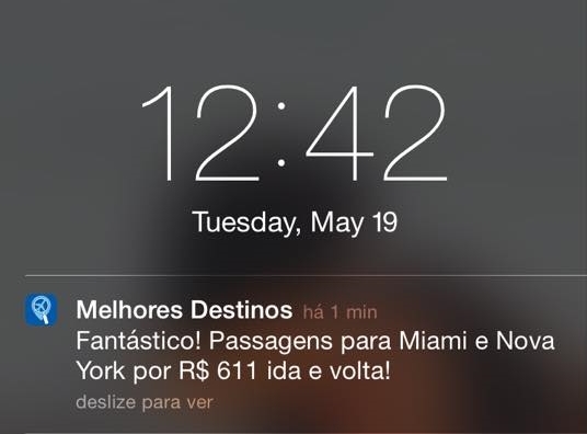 Notificação de promoção do aplicativo Melhores Destinos Aplicativos de viagens disponibilizam promoções-relâmpago, como Melhores Destinos e Passagens imperdíveis. Por intermédio deles, o consumidor recebe notificações em tempo real de promoções de passagens aéreas para destinos do mundo inteiro. Segundo Caldeira Junior, “os aplicativos de viagem estão ajudando de uma forma importante aquelas pessoas que querem viajar, mesmo com a alta do dólar. Estar atento a eles ajuda bastante a economizar”. Os aplicativos estão disponíveis na Apple Store e Google Play.