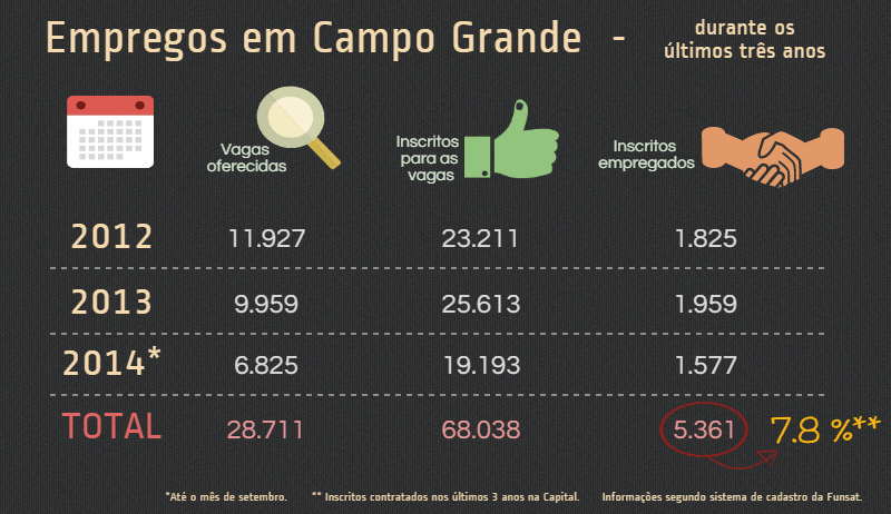 Conforme os dados da Funsat, a baixa admissão de funcionários pode ser observada no quadro geral de vagas, pois muitas vezes o empregador não especifica o tipo de posto que oferece, e a Fundação tem dificuldade em separar o que é ou não emprego temporário. O percentual de pessoas que procurou uma vaga de trabalho na Funsat e conseguiu um emprego não passou de 8% na soma dos últimos três anos em Campo Grande. Os dados do infográfico a seguir são de vagas fixas e temporárias, mas demonstram que a oferta de empregos diminuiu.