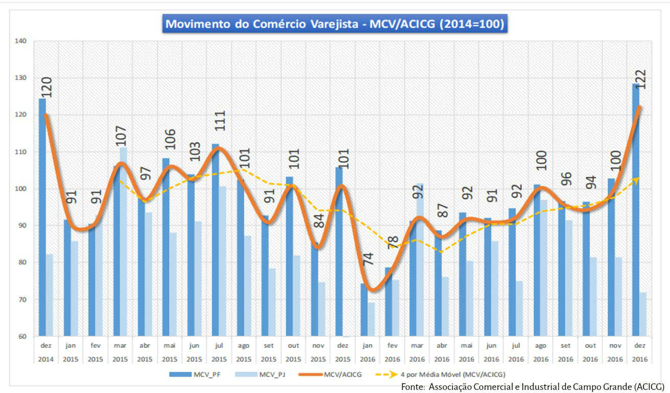 O setor de comércio de Campo Grande teve as melhores vendas no mês de dezembro de 2016, desde o ano de 2012, conforme pesquisa do Movimento do Comércio Varejista (MCV), realizada pela Associação Comercial e Industrial de Campo Grande (ACICG). No ano passado, houve melhora a partir do mês de setembro. De acordo com o economista-chefe da AICG, Normann Kallmus "as condições gerais são de melhora, embora a recuperação do comércio ainda seja lenta".