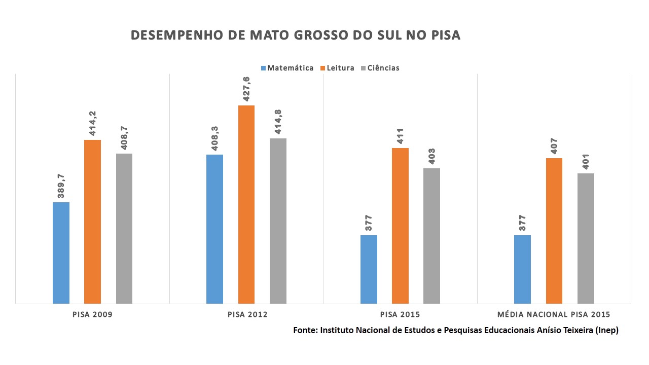 O Instituto Nacional de Estudos e Pesquisas Educacionais Anísio Teixeira (Inep) apresentou, no início deste mês, os resultados do Brasil no Programa Internacional de Avaliação de Estudantes (Pisa), referentes à 2015. Segundo o relatório, Mato Grosso do Sul está na oitava posição na avaliação de leitura, quatro pontos acima da média nacional; nona em ciências, dois pontos acima da média; e em 11ª em matemática, com a mesma pontuação nacional.