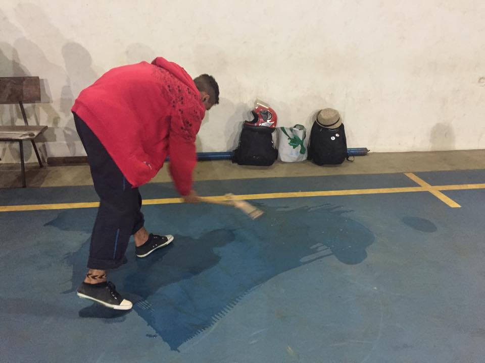 Aluno de capoeira limpa a quadra antes do treino