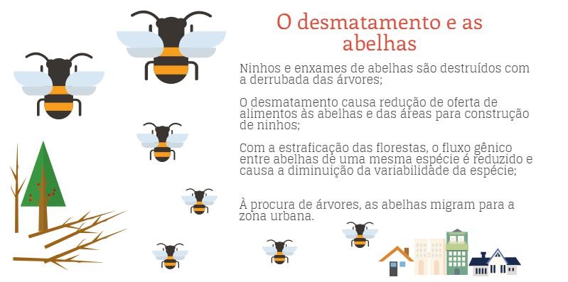 De acordo com Nadeus, a redução da oferta de alimentos às abelhas e a redução das áreas de nidificação causada pelo desmatamento e pelas queimadas são os principais motivos para a migração e mortandade destes animais. "Por causa dessa saída da natureza, elas procuram locais como proteção, como forros, paredes, canos, caixas de esgoto e de energia, já que elas não tem mais natureza e acaba se instalando ali".