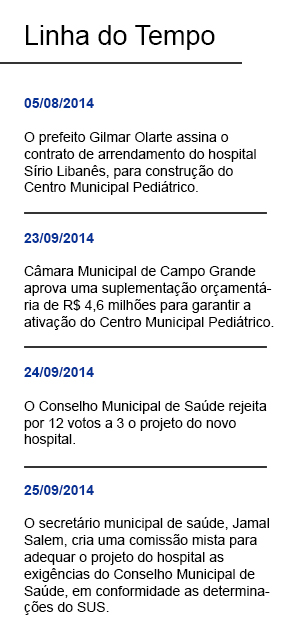O Conselho Municipal de Saúde (CMS), em reunião realizada no dia 24 de setembro, rejeitou por 12 votos a três o projeto do novo hospital enviado pelo prefeito Gilmar Olarte, com isso a construção do Centro Municipal Pediátrico continua sem definição. No dia anterior a votação do Conselho, a Câmara Municipal de Campo Grande aprovou, por unanimidade, uma suplementação orçamentária no valor de R$ 4,6 milhões para garantir a ativação do Centro. A Secretaria Municipal de Saúde (SESAU) criou uma comissão mista para adequar o projeto as exigências do Conselho.