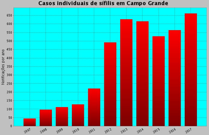 A escala de notificações individuais de sífilis teve aumento de mais de 6,5 mil casos nos últimos 10 anos. Em 2007, foram 45 registros. O Ministério da Saúde incluiu a doença na lista de epidemias nacionais em 2015, ano em que houve aumento em 10 estados, entre eles Mato Grosso do Sul, que apresentou crescimento de 6% entre 2014 e 2015.