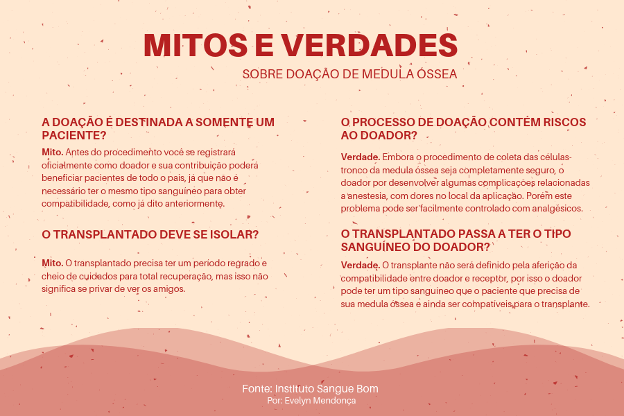 A medula óssea é caracterizada como um dos maiores órgãos do corpo humano, o tecido se localiza no interior dos ossos e é responsável pela produção das células do sangue, como hemácias e leucócitos. De acordo com a médica hematologista Barbára Sales, existem alguns mitos que envolvem a doação de medula óssea. “É muito comum a confusão de que a medula óssea é retirada no interior da coluna vertebral, na verdade, a medula espinhal é formada por tecido nervoso e está localizada dentro da coluna vertebral, já a medula óssea é retirada do interior dos ossos da bacia. Outro mito comum é pessoas acreditarem que o transplante é um procedimento cirúrgico, mas na verdade a doação e o transplante são procedimentos clínicos”.