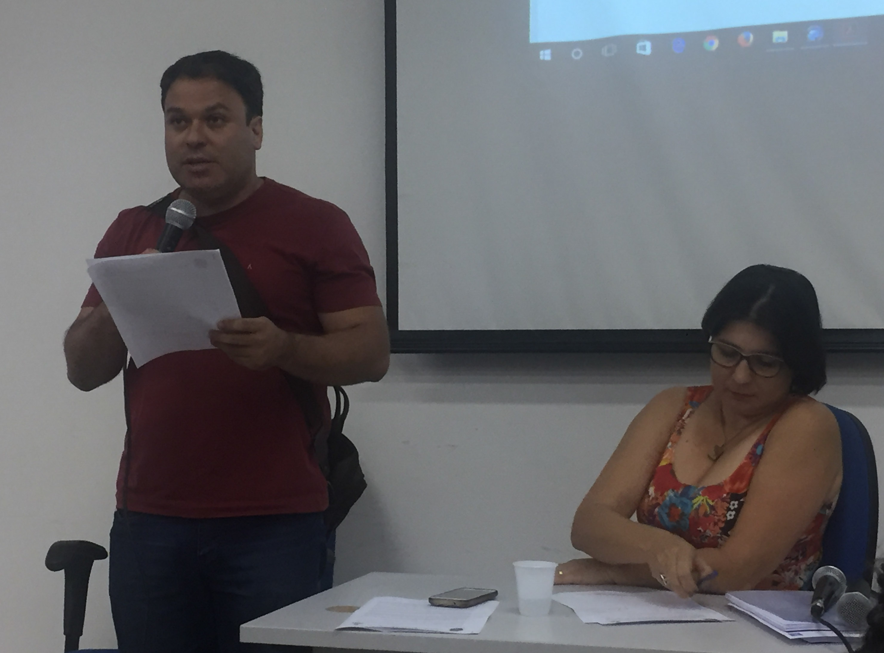 Coordenador do curso de Filosofia lê declaração. Foto: Danielle MugarteO professor e coordenador do Curso de Filosofia, Ricardo Pereira de Melo leu uma carta, na reunião, escrita por ele e pela presidente do Colegiado do curso de História, Dilza Porto Gonçalves que explica os motivos para não se aliarem ao curso de Psicologia. Melo declarou que, "os professores dos cursos ficaram espantados pela decisão de ingresso do curso de Psicologia ao projeto e com a aprovação do Conselho pela adesão. A decisão não foi tomada pelos três cursos que faziam parte do projeto original desde o início. (...) Não aceitaremos nenhuma imposição ao projeto original sem a consulta prévia respeitosa e democrática de todos os professores envolvidos na constituição da nossa faculdade”.