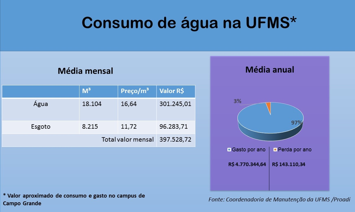 Os acadêmicos e funcionários da instituição podem informar a ocorrência de vazamentos de água, infiltrações e demais problemas de infraestrutura nos prédios da UFMS, pelo telefone do setor de manutenção da Proadi, 3345-7105.